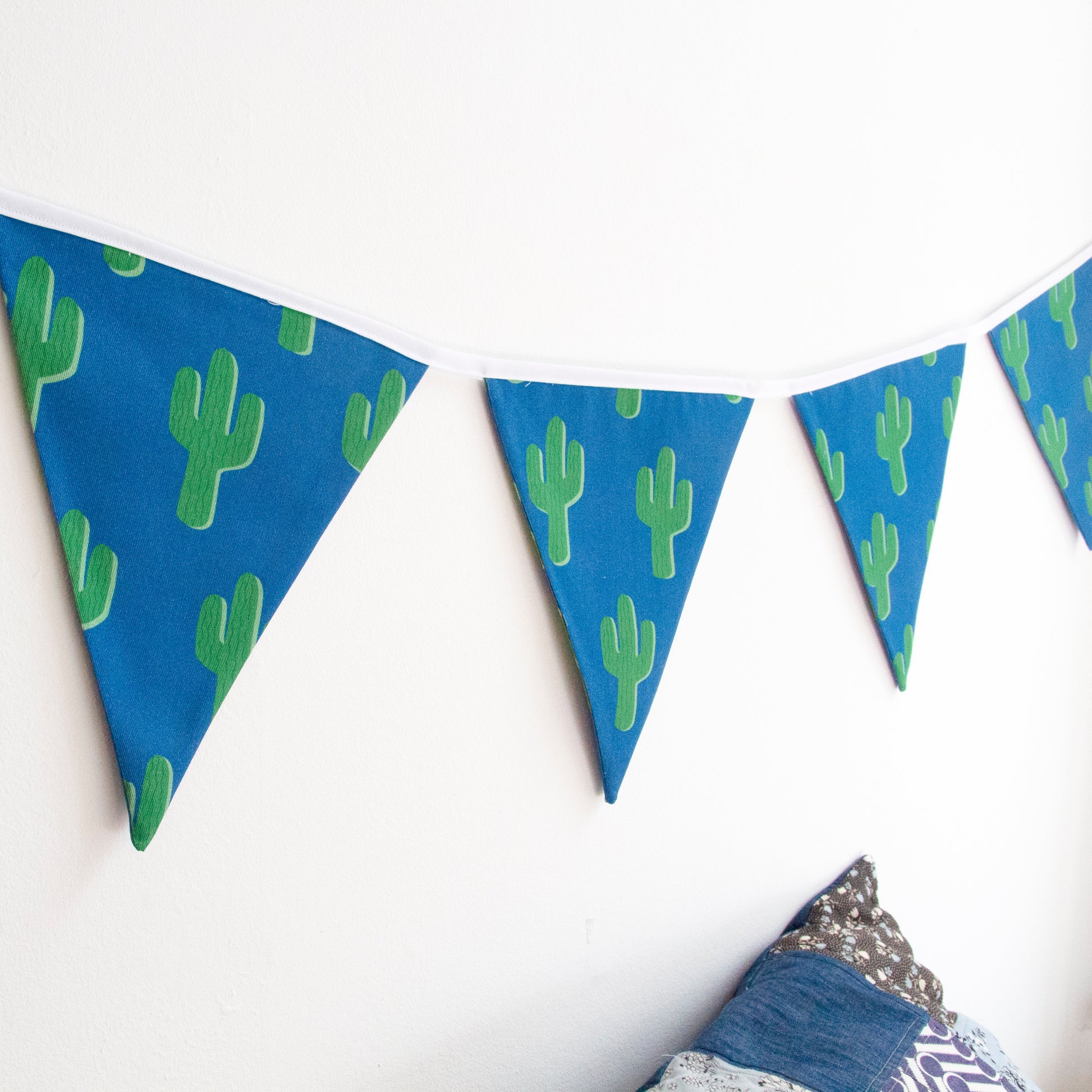 A fun graphic bunting in two colourways, printed on 100% cotton. These flags are a generous size and look bold and colourful. Perfect for an indoor setting or outside for parties or play houses. Double-sided (that looks great from both sides). Finished with white binding and loop ends.